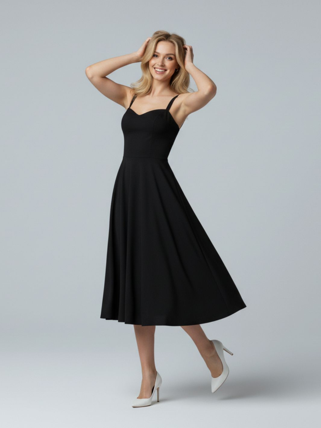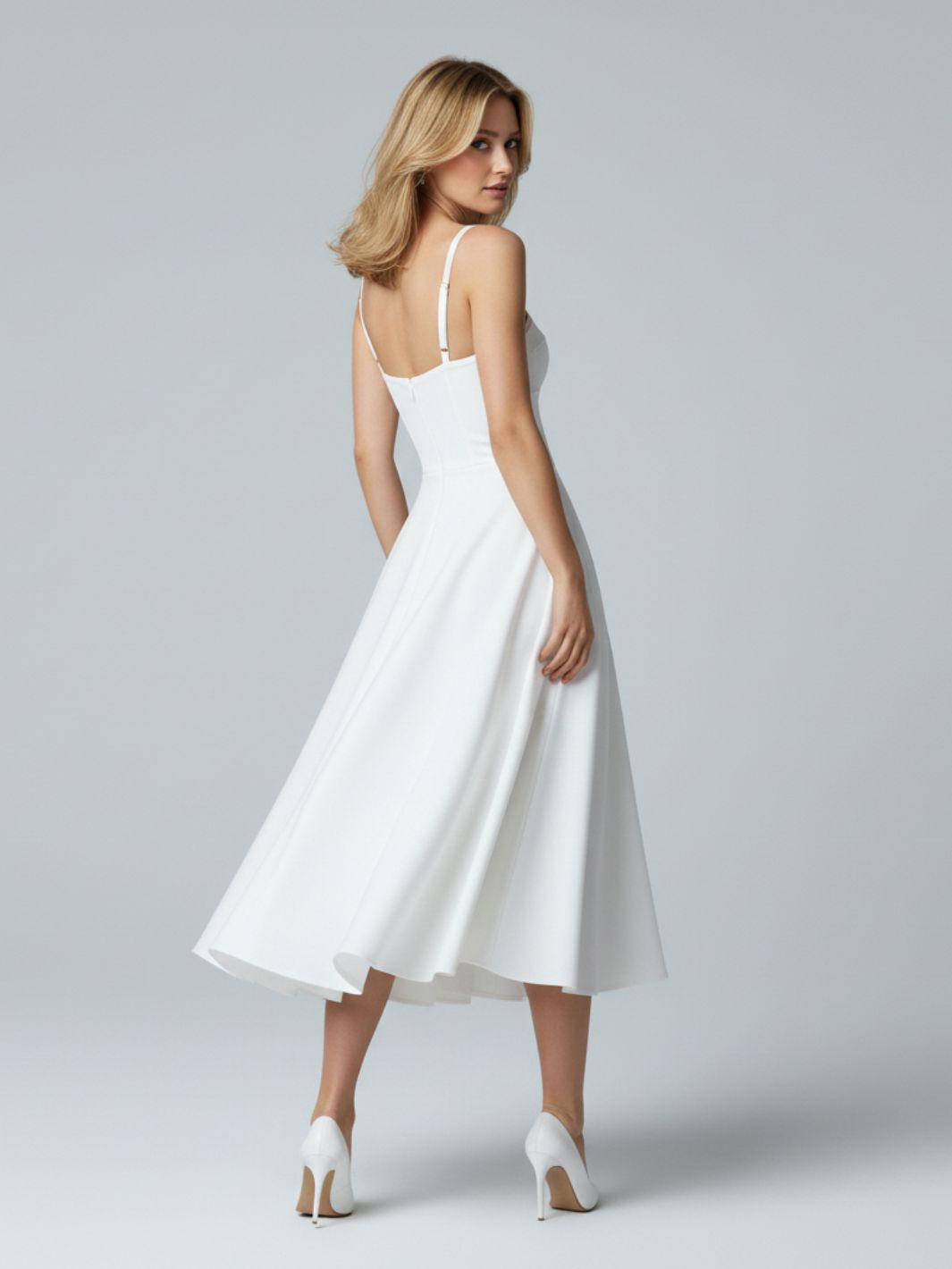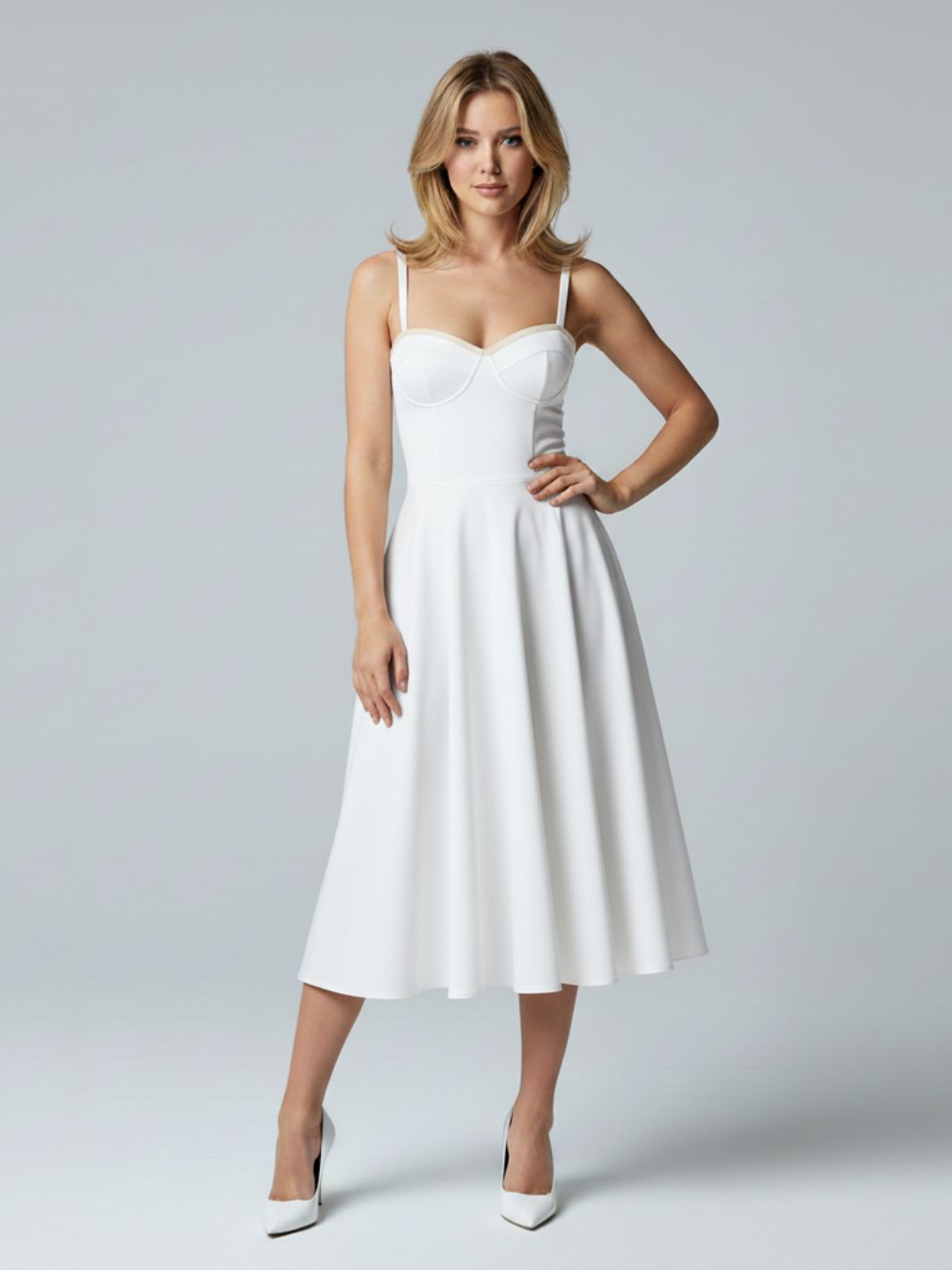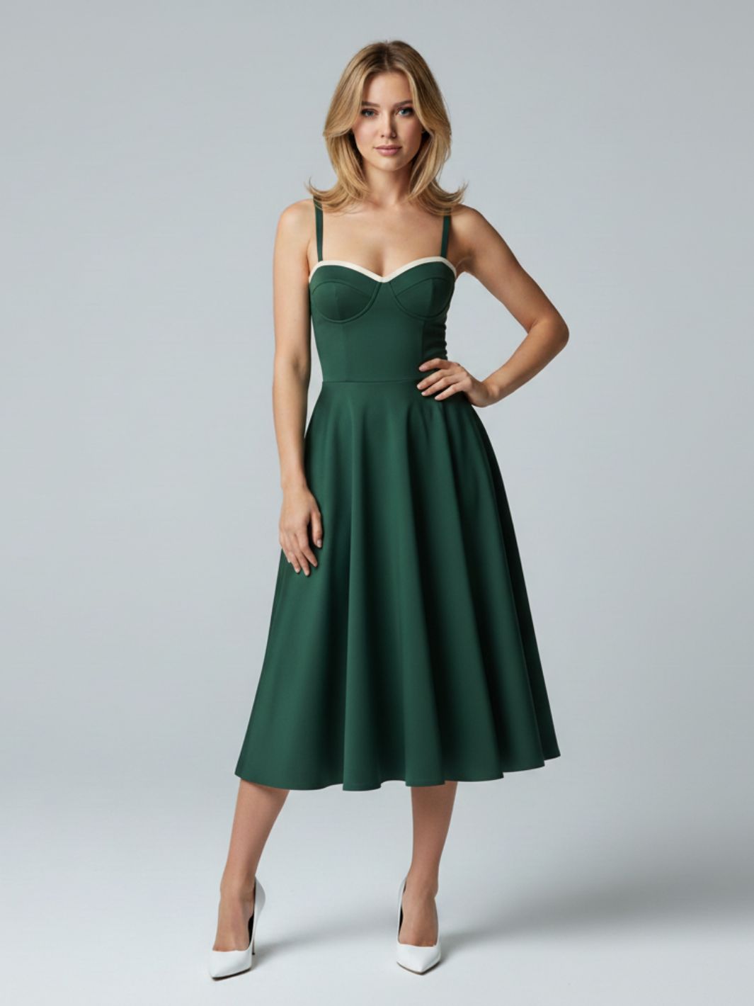 This midi dress features a bustier-style bodice with thin adjustable straps and a sweetheart neckline. The fitted bodice has contrast piping detail that frames the silhouette. The tiered skirt flows to midi length with a full pleated construction. The dress has a structured fit through the bodice with a flared skirt. Available in white, dark green, baby blue, black, yellow, pink, and red colorways. Suitable for special occasions or formal events.