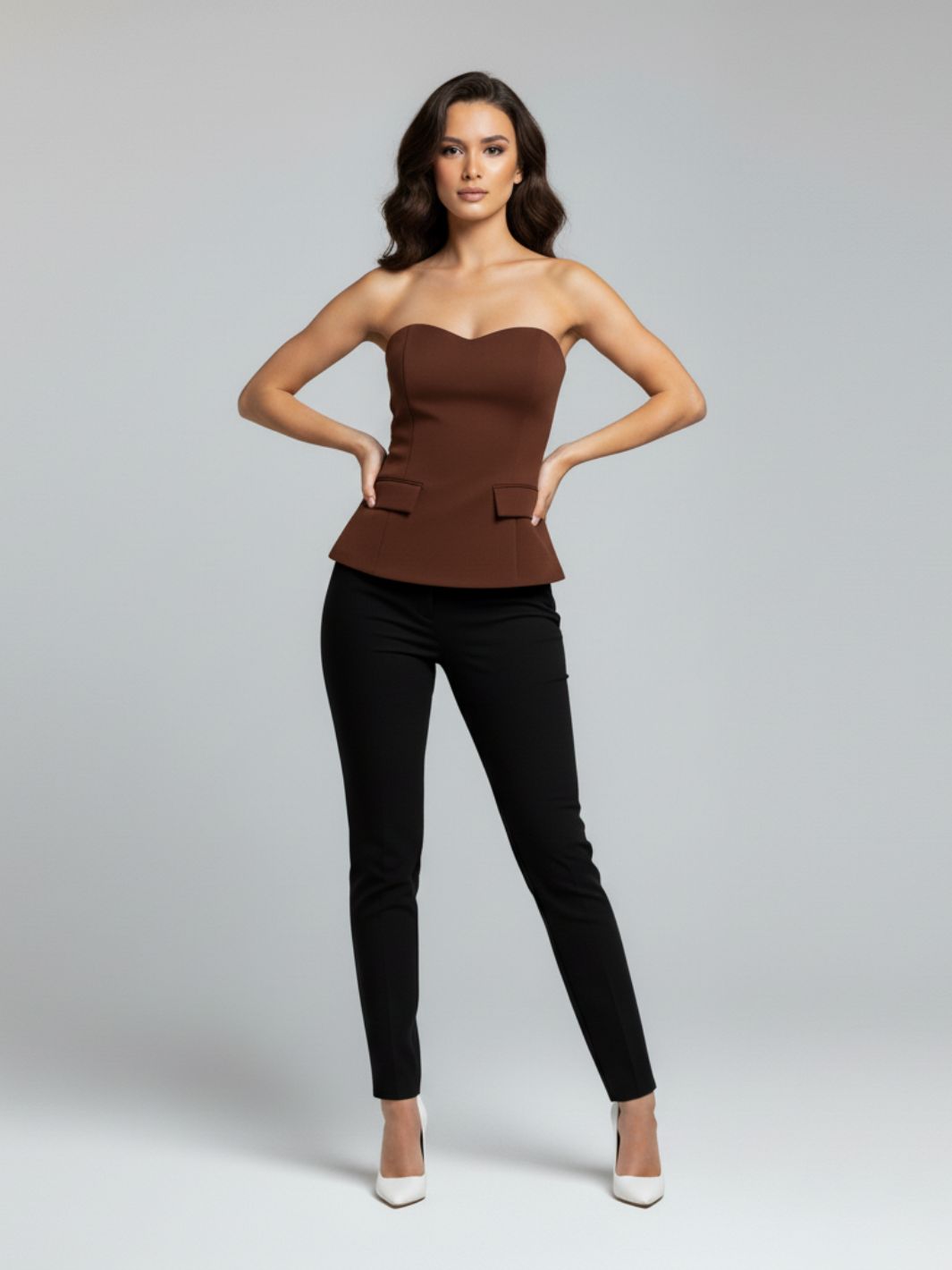 This strapless peplum top features a sculptural silhouette with a notched neckline and structured bodice. The fitted design includes strategically placed pocket details for added dimension. The peplum hem creates a flared shape at the waist. The sleek, construction offers a polished look for elevated styling. Suitable for formal occasions or evening events.