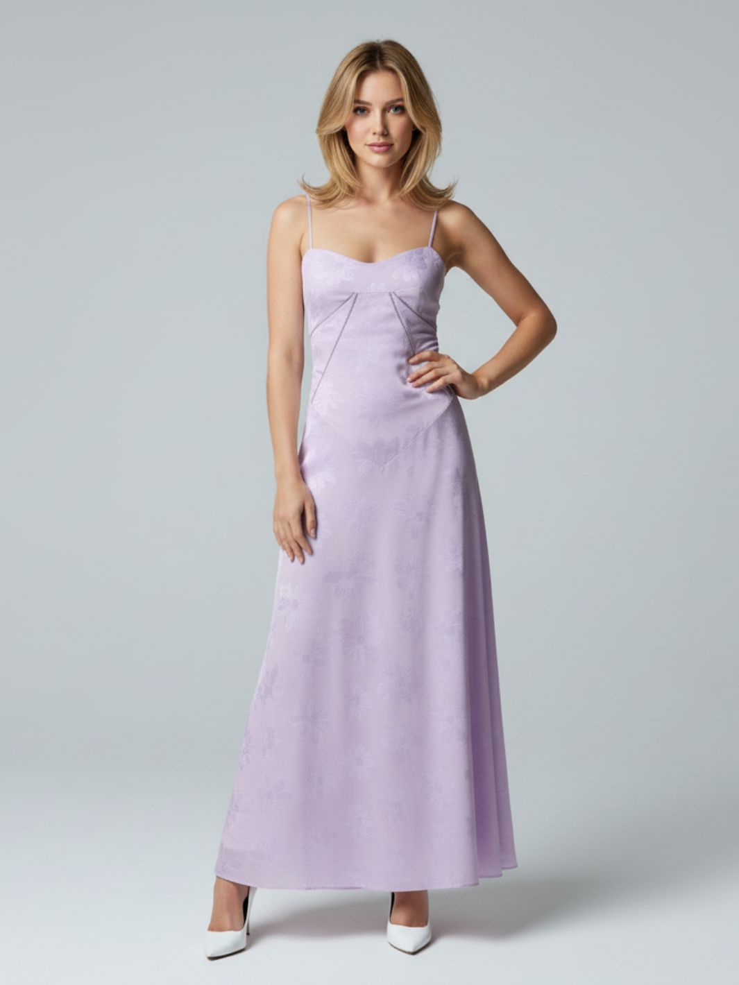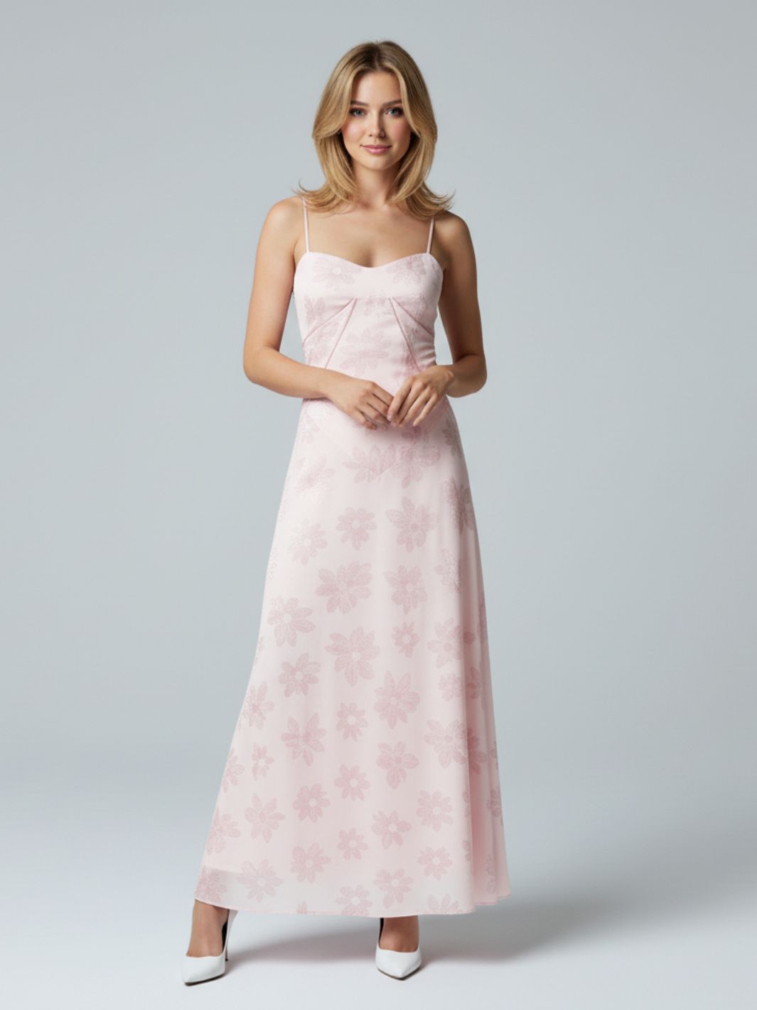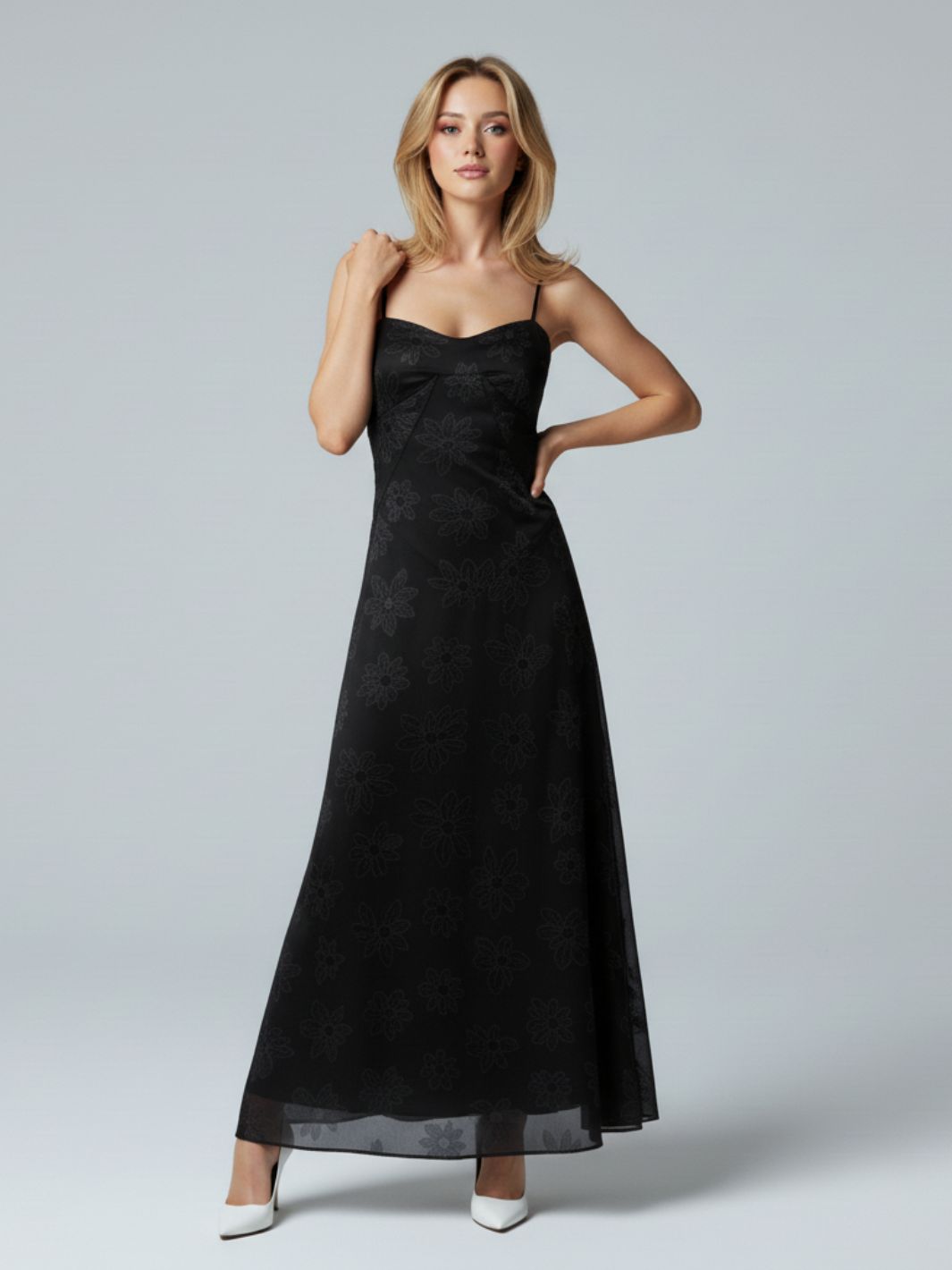 This maxi dress features a sweetheart neckline with delicate thin straps and a corseted bodice. The floral lace jacquard pattern extends from the bodice to the hem throughout the dress. The fitted bust transitions to a flowing A-line skirt that reaches floor length. The sheer construction creates a layered effect. Suitable for formal occasions or special events.