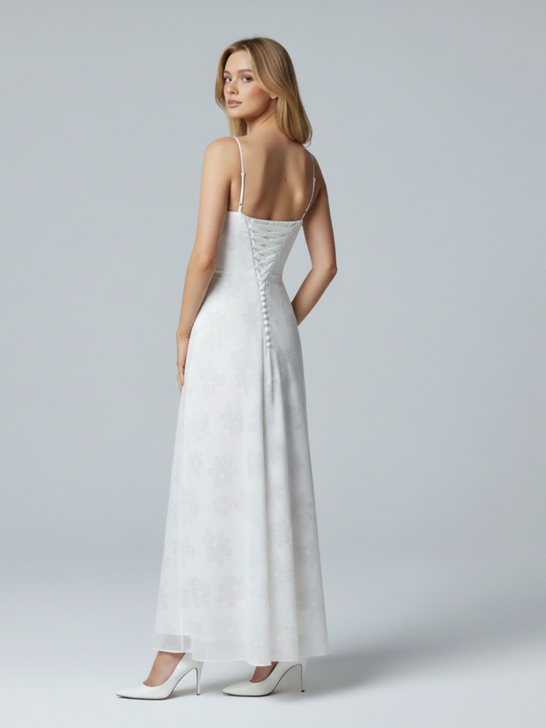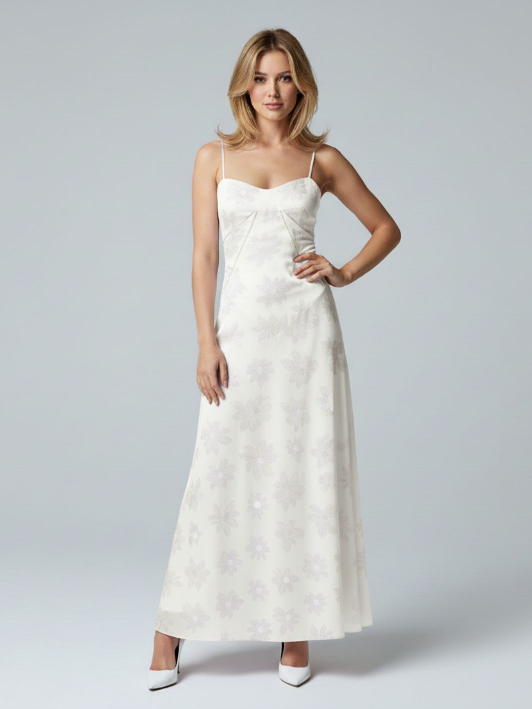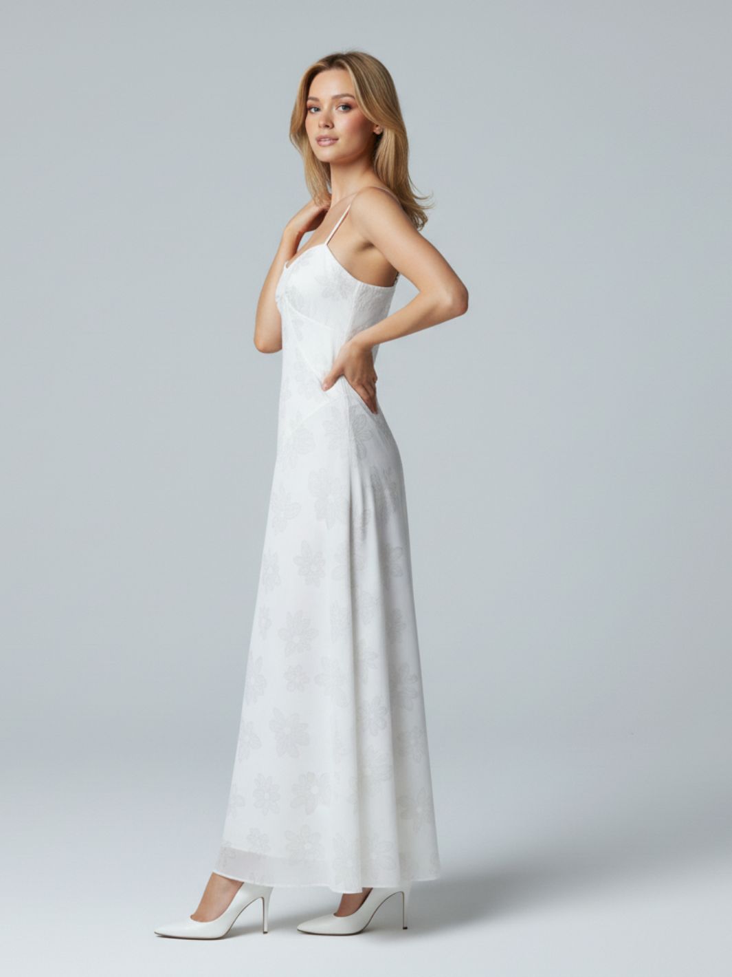 This maxi dress features a sweetheart neckline with delicate thin straps and a corseted bodice. The floral lace jacquard pattern extends from the bodice to the hem throughout the dress. The fitted bust transitions to a flowing A-line skirt that reaches floor length. The sheer construction creates a layered effect. Suitable for formal occasions or special events.