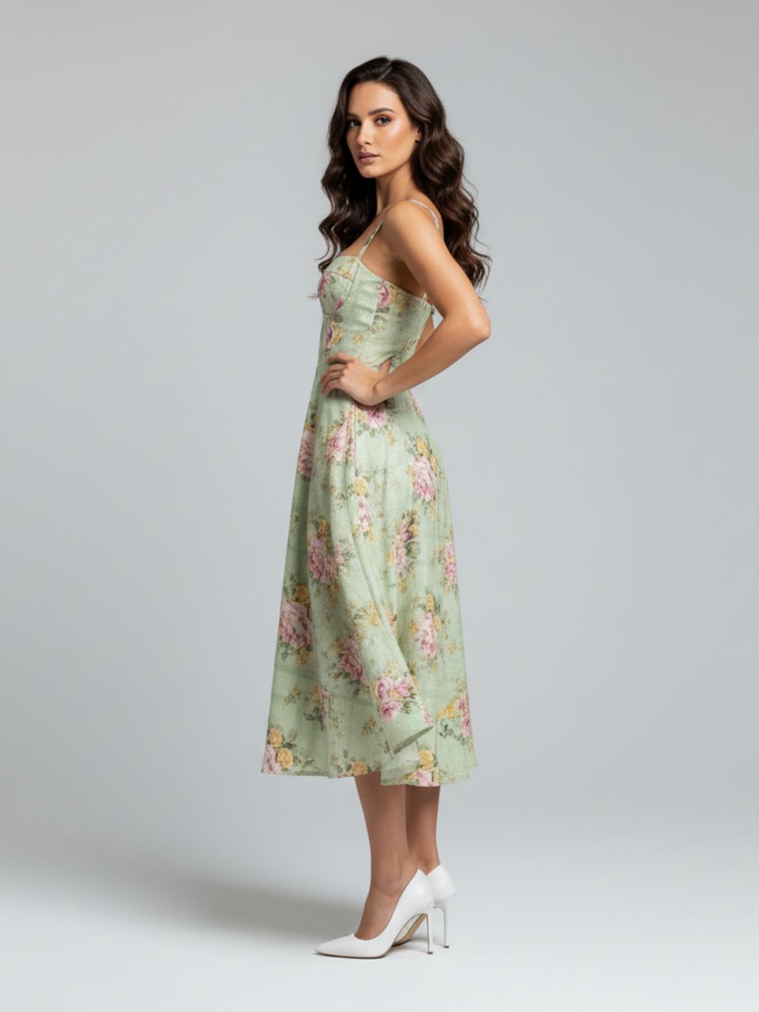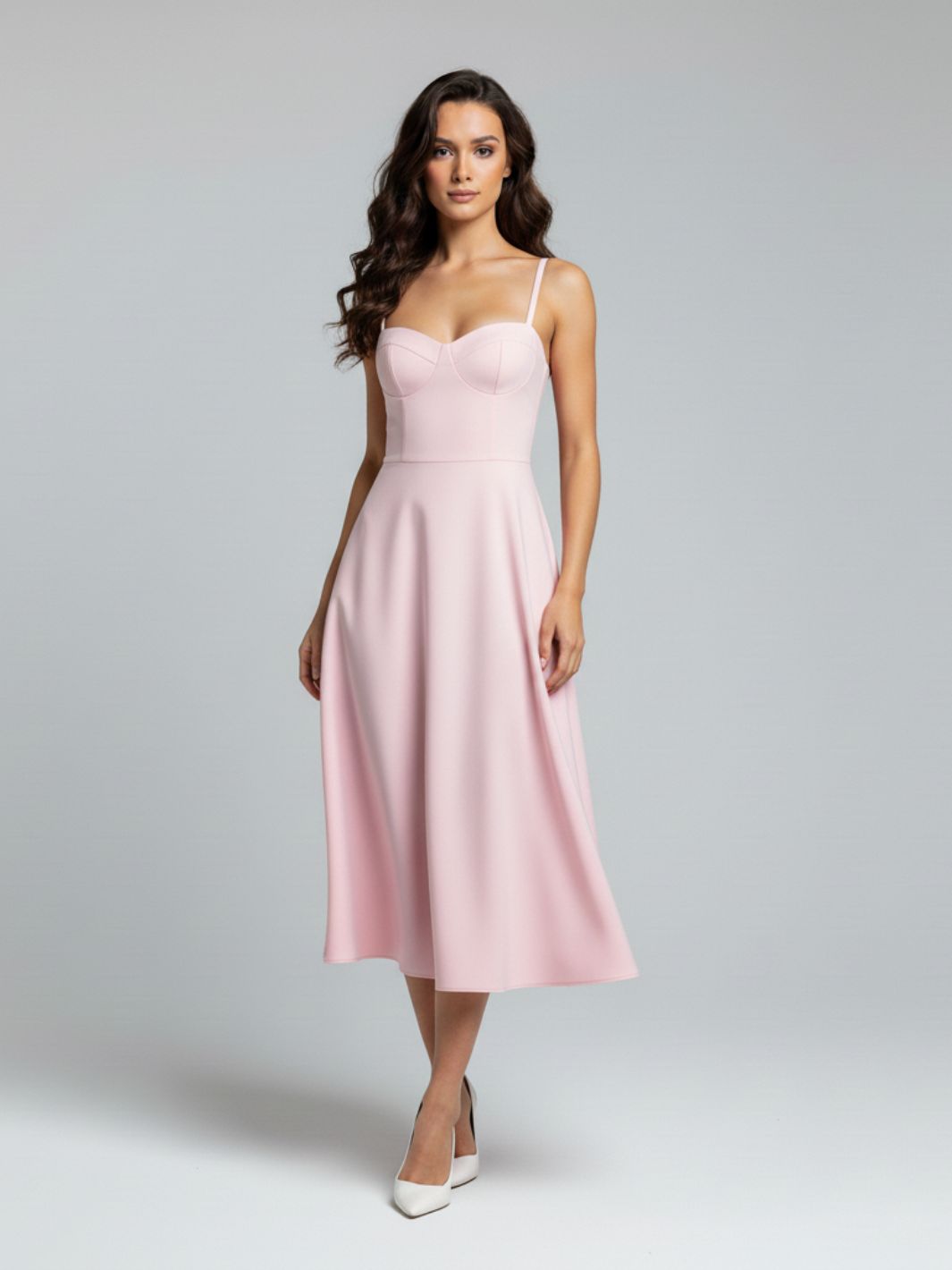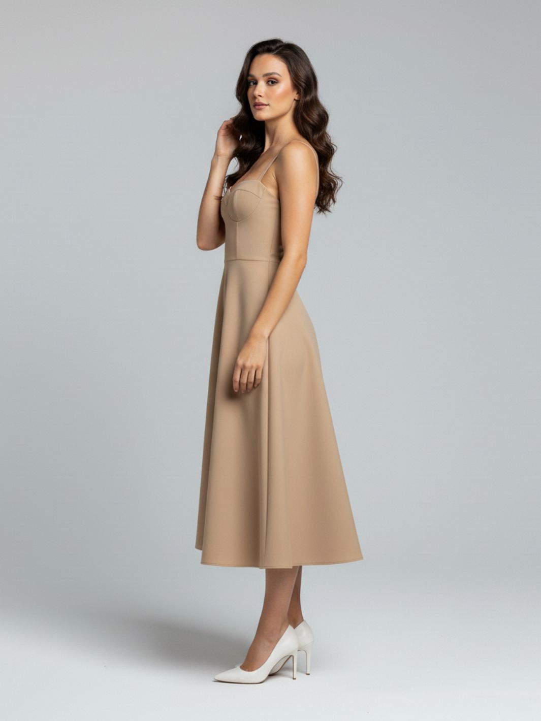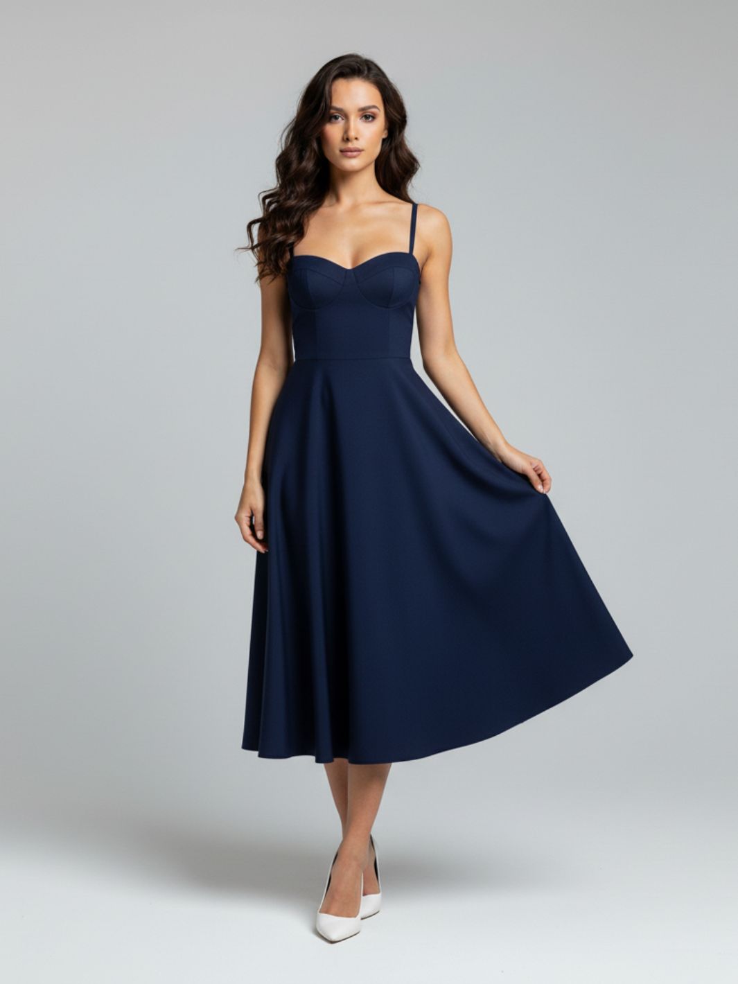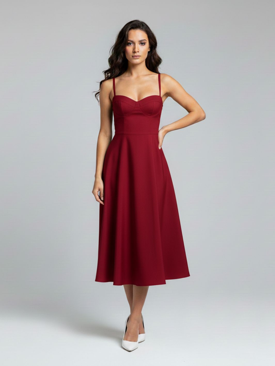 This midi dress features a bustier-style bodice with thin adjustable straps and a sweetheart neckline. The fitted bodice transitions to a tiered skirt with precise pleat placement that creates volume and movement. The midi-length skirt flows with a structured silhouette. Strategic stitching details shape the bodice for a flattering fit. Suitable for special occasions or formal events.